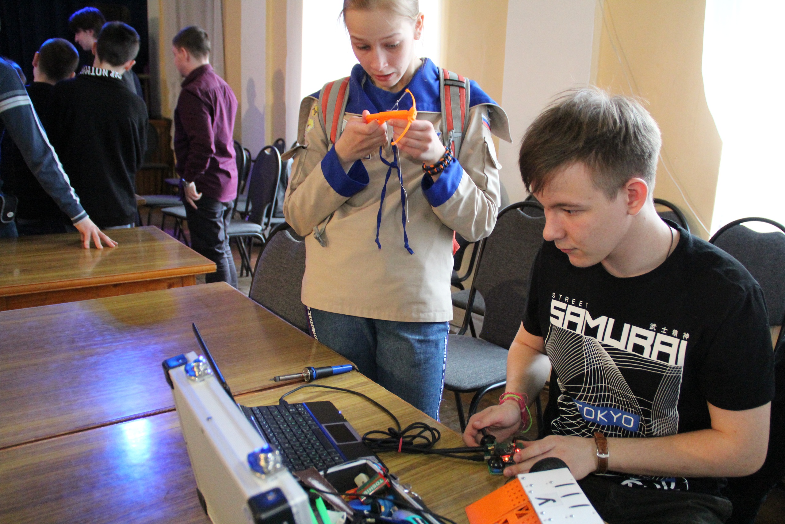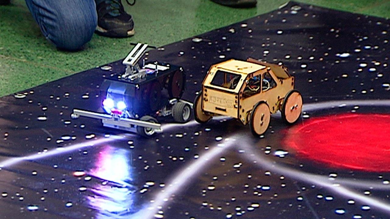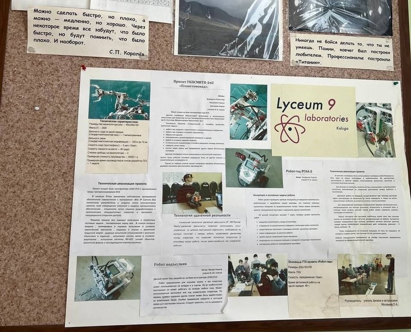 В истории этого аппарата есть ещё один интересный эпизод. Однажды в городе проходила стендовая научная конференция, куда наша команда выдвинула все свои проекты: сам луноход с VR, робот-гид и погрузчик на сдачу. Также наши друзья по кабинету физики делали свои научные стенды: про расчёт расстояния до Луны при помощи лунного затмения, про исследования зависимости формы капель от высоты полёта, про воздуходувку Циолковского и другие не менее интересные работы.