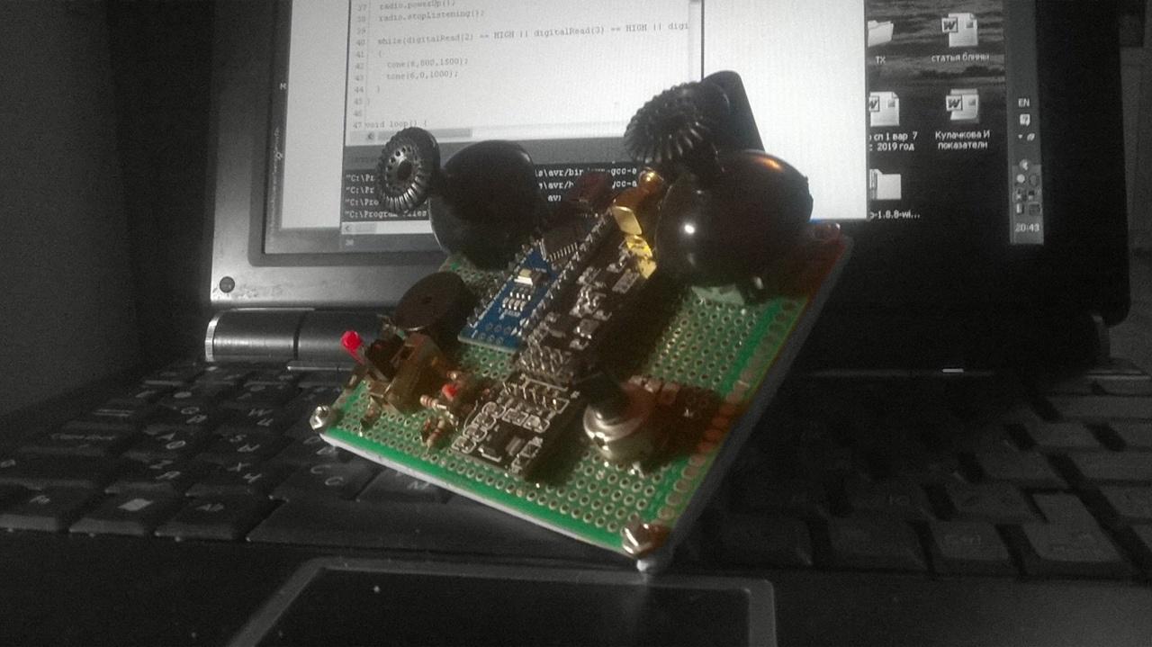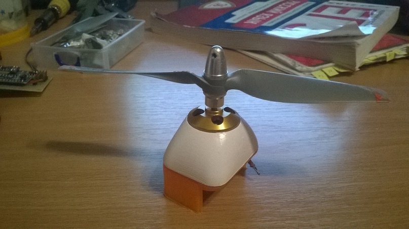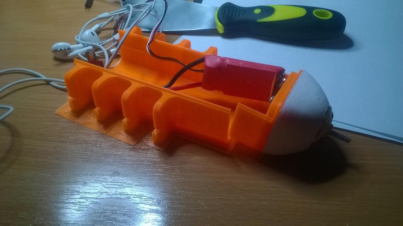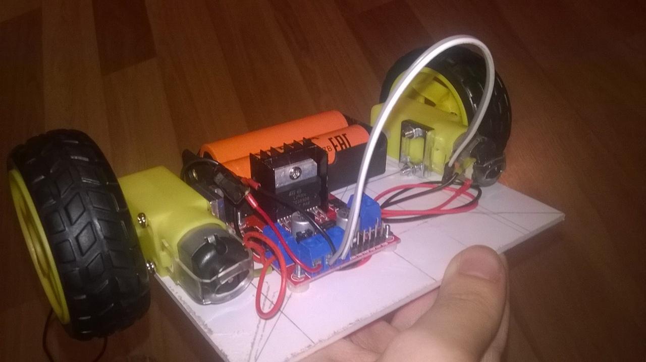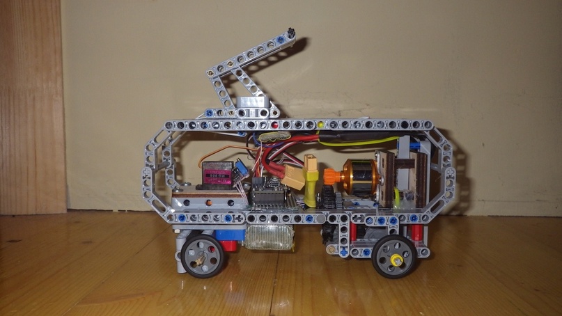 К соревнованиям, описанным в прошлой главе, появилась забавная идея сделать его радиоуправляемым. Под рукой у Гоши была электроника для авиамоделей: бесколлекторный двигатель, рулевая машинка и система радиопередачи. Из этого за вечер получилось сделать не только трамвай, способный объехать, но и “робота”, скоростным характеристикам которого мог позавидовать любой LEGO-робот. Жаль, не хватило времени пристроить ему электроники для автономной гонки по линии.
